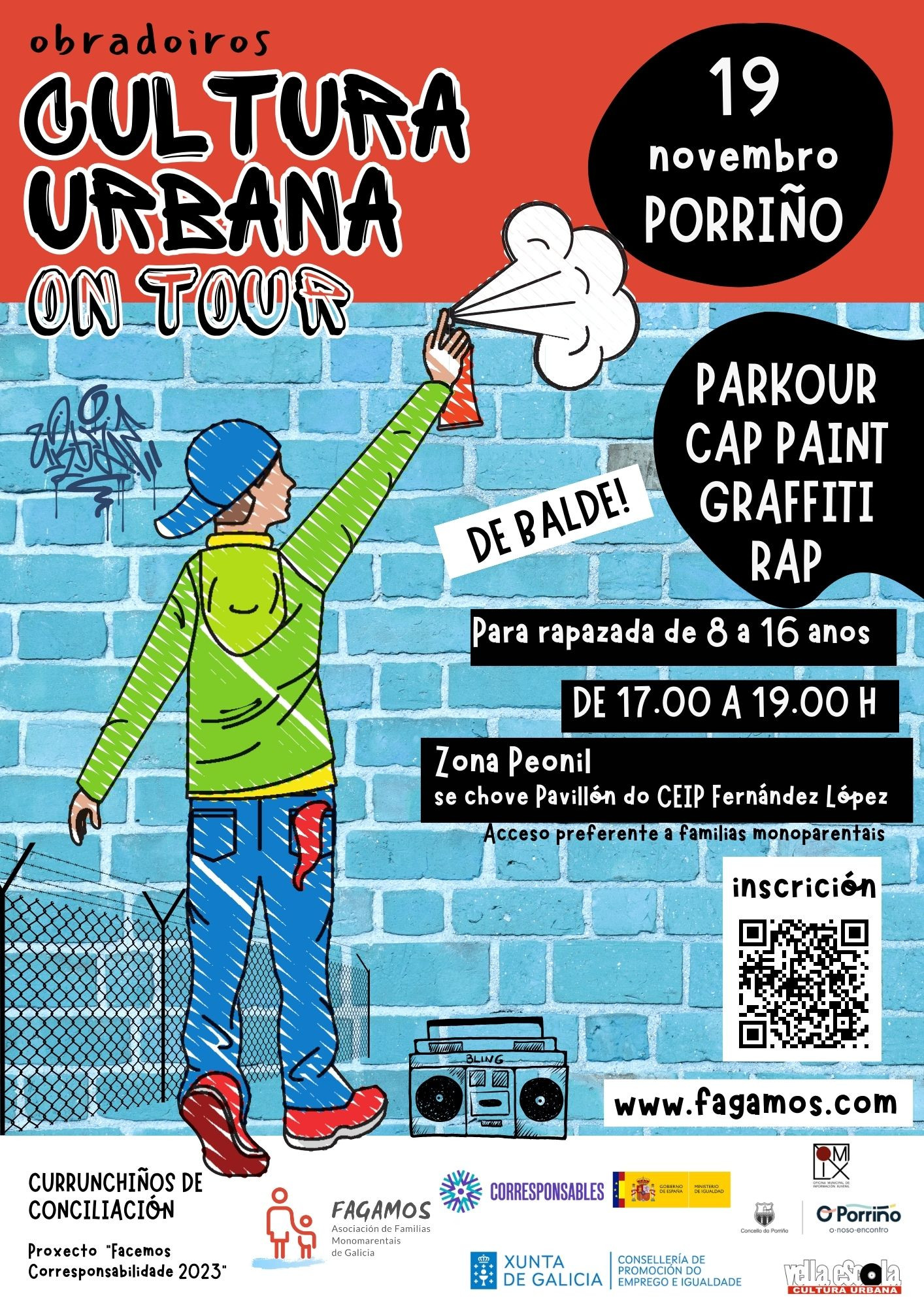 Los participantes de ‘Cultura Urbana On Tour’ podrán probar diferentes disciplinas urbanas en talleres gratuitos donde se impartirán nociones de parkour, rap o grafiti. Las actividades tendrán lugar entre las 17:00 y las 19:00 horas y se puede solicitar la inscripción previa escaneando el código QR del cartel del evento.