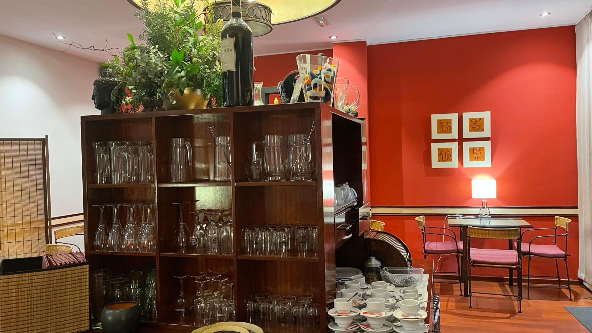Una lámpara de gran tamaño preside la sala principal sobre un mueble de madera para el servicio, ambos fabricados expresamente para el local. Los elementos de la decoración, a pesar de lo exótico, está comprados en Vigo y alrededores, al igual que el tapiz que cubre una de las paredes de este negocio familiar, que ha pasado de madre a hija y que ambas sacan adelante.