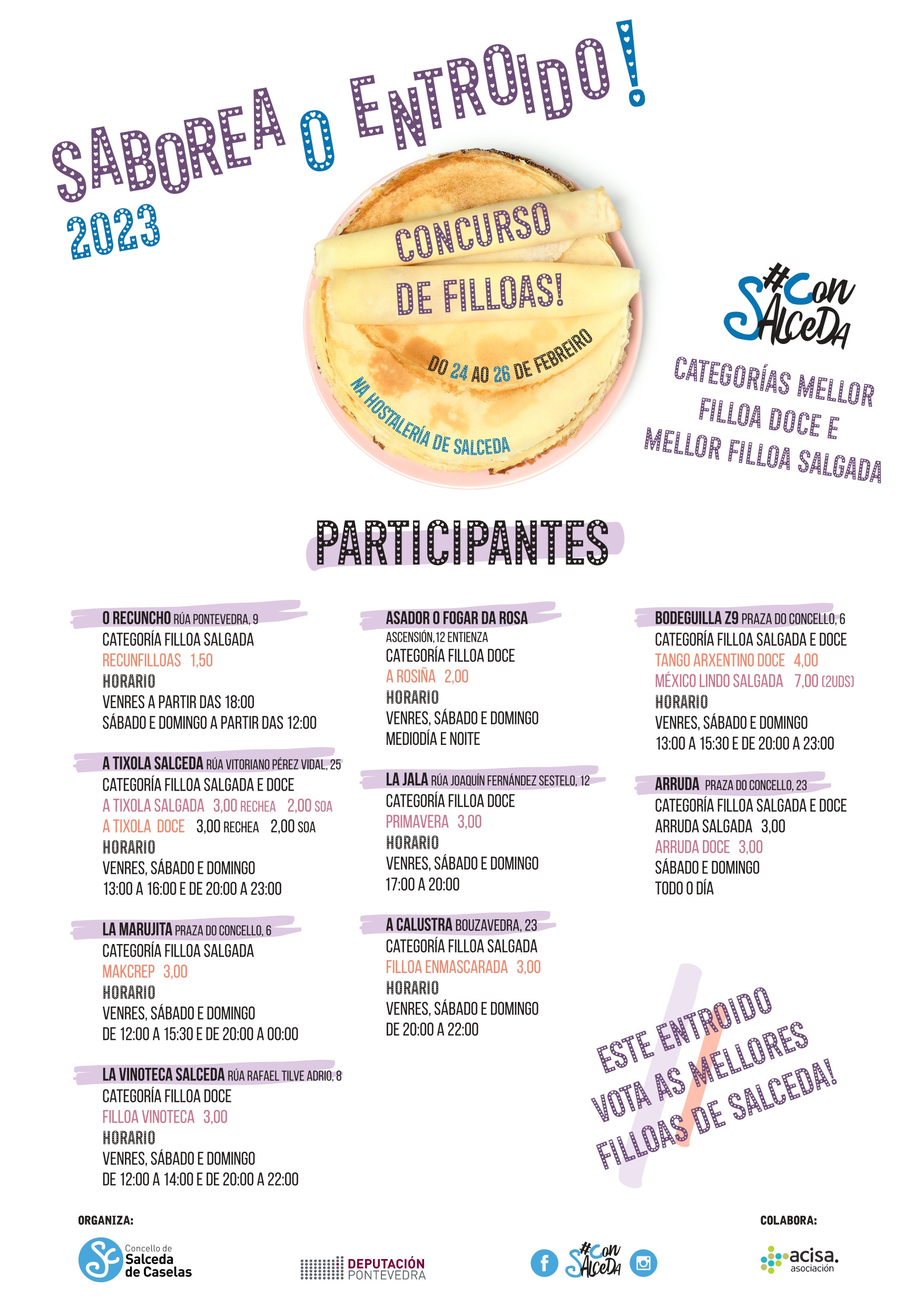 El certamen se desarrollará los días 24, 25 y 26 de febrero entre los siguientes establecimientos de la hostelería local: O Recuncho, A Tixola Salceda, La Marujita, La Vinoteca Salceda, Asador O Fogar da Rosa, La Jala, A Calustra, Bodeguilla Z9 y Café Arruda. Los negocios competirán en dos categorías, filloa dulce y filloa salada.