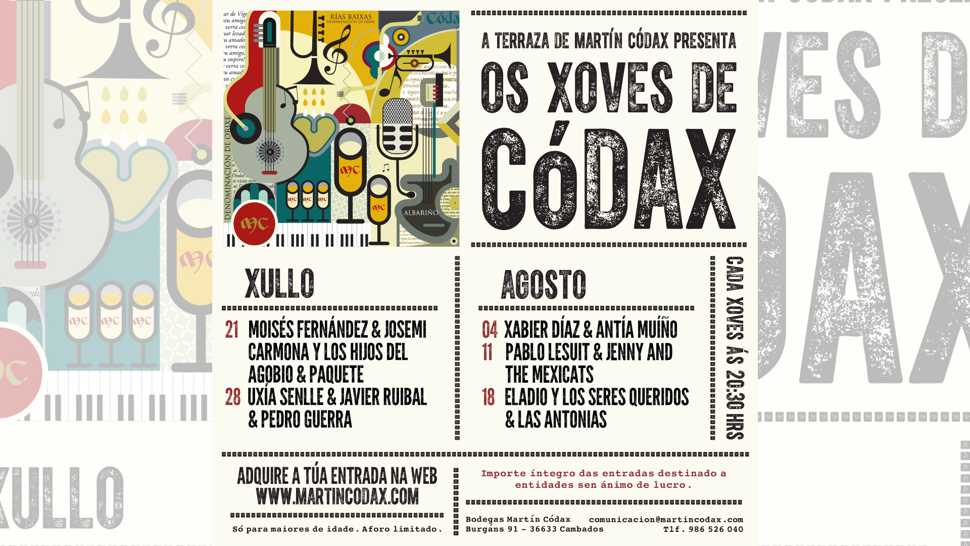 Bodegas Martín Códax presenta la IX edición del ciclo musical "Os Xoves de Códax", en el que ofrece una programación con reconocidos artistas. Los conciertos, que se celebrarán cada jueves desde el 21 de julio al 18 de agosto a las 20:30 horas, estarán marcados por la gran variedad de estilos fusionados entre sí, abarcando desde flamenco, indie, música de autor y rocky folk gallego.