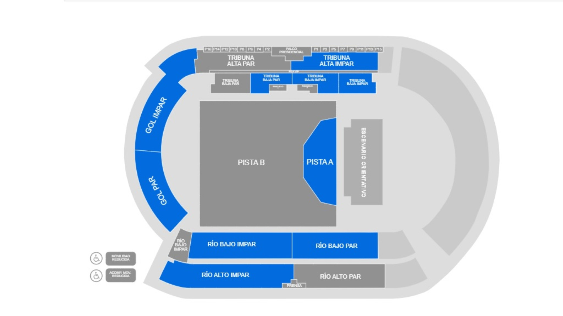 Por lo tanto, el "escenario orientativo" que refleja la imagen, estará enfocado hacia la grada de Gol; delante del escenario, dos espacios principales, la pista A y la pista B, que tienen un precio de 136 y 96,60 euros, respectivamente. En Tribuna Baja impar, las entradas son de 153 y 175 euros y en Tribuna Baja par, de 153 euros.