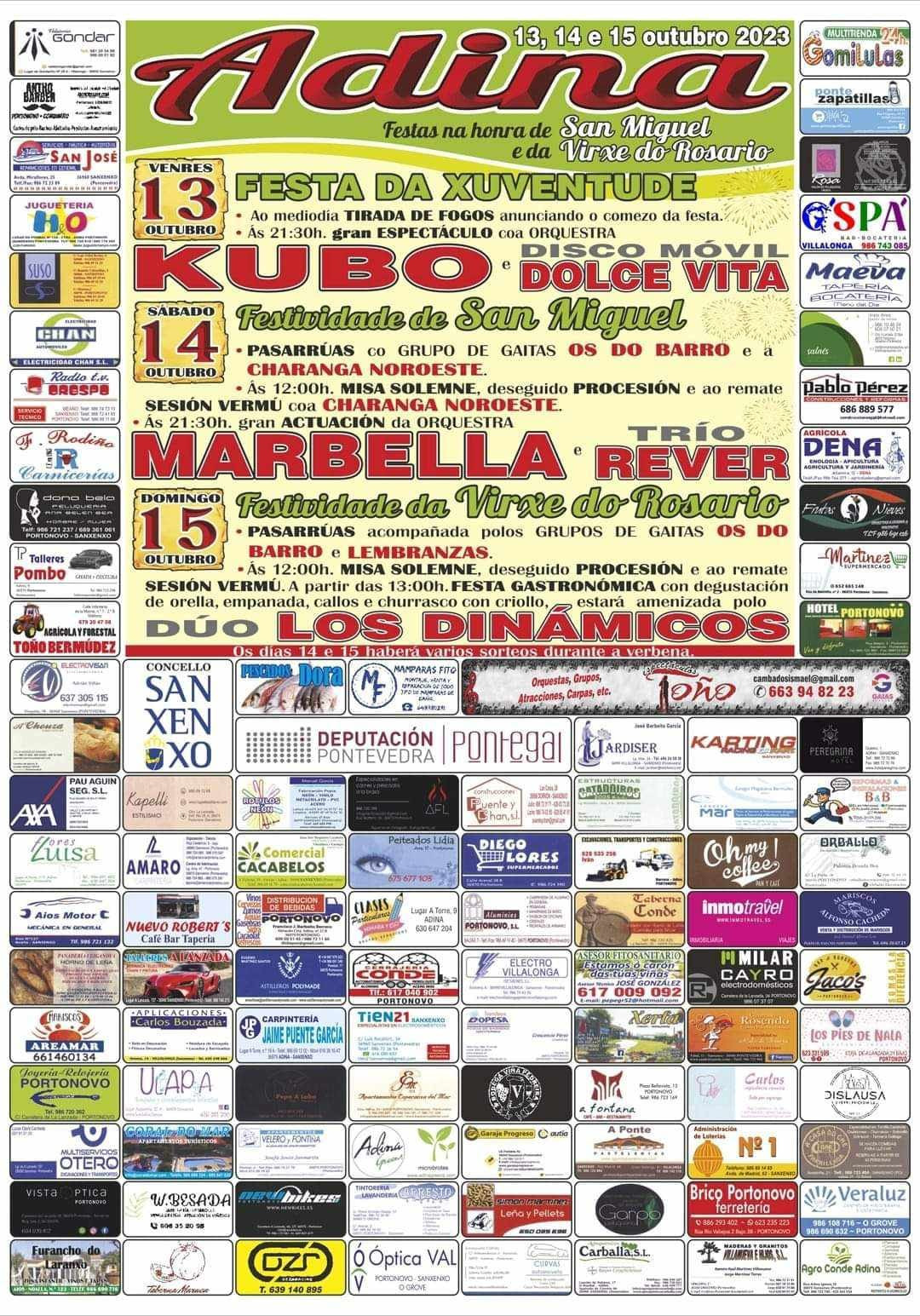 Las fiestas en honor a San Miguel y a la Virgen del Rosario de Adina, en el concello pontevedrés de Sanxenxo, coincidirán con el puente del Pilar y en ellas se podrá disfrutar de música, verbenas, actos tradicionales y un popular evento gastronómico que incluirá la degustación de oreja, callos o empanada, entre otros productos típicos de Galicia.