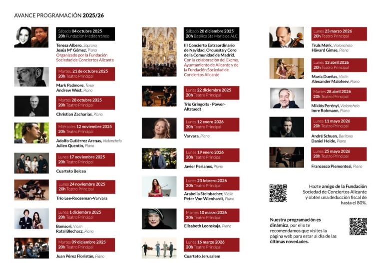 Se sortearán (2) entradas dobles de palco para cada uno de los conciertos de la temporada 2025-2026 (https://sociedadconciertosalicante.com/agenda/) de la Sociedad de Conciertos de Alicante en el Teatro Principal.